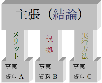 結論、メリットと、それを支える事実資料、根拠とそれを支える事実資料、実行方法です。